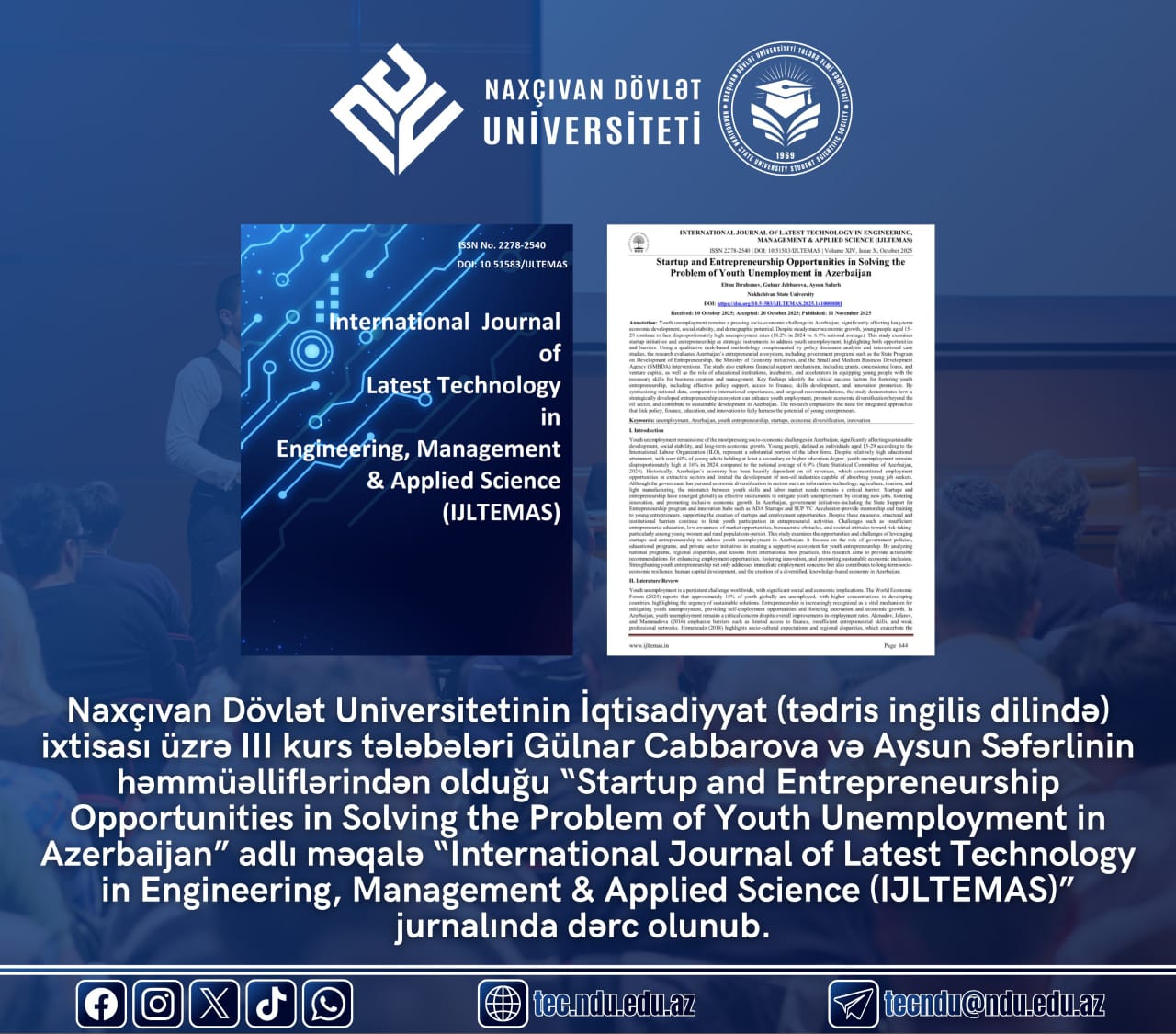 İqtisadiyyat (tədris ingilis dilində) ixtisası üzrə IlI kurs tələbələri Gülnar Cabbarova və Aysun Səfərlinin müəllifləri olduğu məqalə dərc olunub | NDU TEC